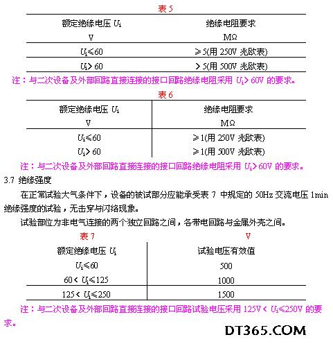 3.5.3 脈沖量 a.輸入回路采用光電隔離; b.脈寬≥10ms; c.接口電平:0~5V,0~12V,0~24V。 3.5.4 信息通道 a.傳輸速率:(50),(200),300,600,1200,2400bit/s; 注:括號內數字不推薦。 b.工作方式:單工、半雙工、全雙工; c.比特差錯差≤1×104; d.接收電平:-40~0dB; e.發送電平:0~-20dB。 3.5.5 遠動規約 循環式(CDT)遠動規約應符合電力行業標準DL 451。 3.5.6 遙控輸出接點容量:直流110V、5A或220V、5A,24V、1A。 3.6 絕緣電阻 3.6.1 在正常試驗大氣條件下絕緣電阻的要求見表5。 3.6.2 濕熱條件(溫度40±2℃,相對濕度90%~95%,大氣壓力86~108kPa)下絕緣電阻的要求見表6。