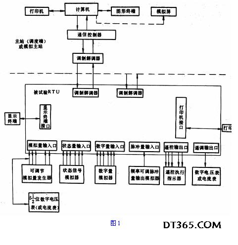 3.8 高頻干擾適應能力 在正常工作大氣條件下設備處于工作狀態時,施加3.8.1條和3.8.2條所規定的高頻干擾,由電子邏輯電路組成的回路及軟件程序應能正常工作。 3.8.1 高頻干擾波特性 波形:衰減振蕩波,包絡線在3~6周期后衰減到峰值的50%; 頻率:1±0.1MHz; 重復率:400次/s。 3.8.2 高頻干擾電壓值 3.8.2.1 下列回路按共模1kV,串模0.5kV(均指干擾發生器未與被試品連接的空載情況下的第一半波峰值)進行試驗; a.設備接于專用的穩壓電源或逆變電源,從電源到設備的引線長度小于50m的電源回路; b.不直接與電流互感器或電壓互感器連接的信號輸入回路; c.引線有較好屏蔽接地的信號輸入回路。 3.8.2.2 下列回路按共模2.5kV、串模1kV(均指干擾發生器在未接入被試品的空載情況下的第一半波峰值)進行試驗; a.直接接于站內公用蓄電池的直流電源回路; b.直接與電流互感器或電壓互感器連接的輸入回路; c.引線長度在50m以上又沒有采取有效的屏蔽接地的輸入信號回路; d.與負載的連接線長度在50m以上的輸出回路。 3.9 連續通電試驗 設備完成調試后,在出廠前進行不少于72h連續穩定的通電試驗,交直流電壓為額定值,各項參數和性能均應符合技術要求。 3.10 振動 設備應能承受頻率f≤10Hz時振幅為0.3mm及f>10~150Hz時加速度為1m/sp的振動。 3.11 可靠性 平均無故障工作時間(MTBF)應不低于8760h。 4 試驗方法 4.1 試驗條件 除非另有規定,試驗大氣條件下不應超出下列范圍: a.環境溫度15~35℃; b.相對濕度45%~75%; c.大氣壓力86~106kPa。 4.2 絕緣電阻試驗 按3.6條規定對設備用相應電壓的兆歐表測量絕緣電阻,測量時間不小于5s。 在試驗整機對地絕緣電阻時,應拔出裝有半導體器件(光耦器件除外)的印制板。 4.3 絕緣強度 按3.7條規定用擊穿電壓測試儀進行絕緣強度試驗。試驗電壓從零起始,在5s內逐漸升到規定值并保持1min,隨后迅速平滑地降到零值,測試完畢斷電后用接地線對被試品進行安全放電。 對額定電壓為60V以下的半導體器件(光耦器件除外),在對整機進行絕緣強度試驗時應采取防護措施,如拔出有關插件或短接有關電路等。 4.4 功能試驗 4.4.1 基本設備 a.主站(調度端)或模擬主站設備應包括以下幾部分: 雙工調制解調器、通信控制器、計算機、圖形終端(CRT)、打印機各一臺。模擬屏根據需要配置; b.模擬量發生器、狀態信號模擬器、數字量模擬器各一套; c.遙控執行指示器一套; d.頻率可調脈沖量輸出模擬器一臺; e.512位數字電壓表及電流表各一塊; f.被測RTU一套,包括RTU主機、顯示終端(CRT)、打印機等。 將上述設備連接成一個一對一數據采集與監控系統,并通電運行,如圖1所示。