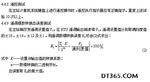 4.4.3 狀態量(開關量)輸入測試 在狀態信號模擬器上撥動任一路模擬開關,則在CRT屏幕上應觀察對應遙信位的變化與撥動的開關狀態相一致,重復上述試驗10次以上。 4.4.4 事件順序記錄站內事件分辨率的測試 在狀態信號模擬器的兩路輸出信號接至RTU設備任意兩路狀態量輸入端,在狀態信號模擬器上設置一個時間定值,使該定值等于3.5.2f條規定的站內分辨率。啟動狀態信號模擬器工作,這時除在圖形終端有正確告警顯示外,打印機應打印出這兩個狀態量的名稱、狀態及動作時間,其中開關動作所顯示和記錄的時間應符合站內分辨率的要求。重復上述試驗5次以上。 4.4.5 數字量輸入測試 利用數字量模擬器設置一組4位十進制數(用BCD碼表示),則在顯示終端或打印機上能顯示或打印出對應的數字遙測量,數值與設置值相同,重復上述試驗10次以上。 4.4.6 脈沖量輸入測試 啟動脈沖量輸出模擬器,在RTU的顯示終端或打印機上進行核對,該數值應與脈沖量輸出模擬器的計數相一致,改變脈沖頻率重做上述試驗5次以上。 4.4.7 與主機通信正確性測試 RTU及主站計算機系統通電后,在主站圖形終端上核對遙測數據及遙信狀態。進行4.4.3條至4.4.6條測試時應在主站的圖形終端上看到數據的變化及事件記錄的告警顯示。主站打印出的事件順序記錄應與RTU打印的事件順序記錄一致。