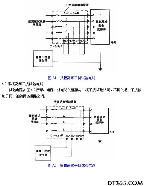 A1 共模高頻干擾試驗電路 試驗電路如圖A1所示,對被試設備施加額定電壓的電源,當對某回路進行干擾試驗時,應將電感L串入該輸入(輸出或電源)回路的外回路中。此處所指的外回路,是模擬3.8.2.2所指的外部回路。高頻干擾波通過電容C加于設備被試回路與外殼之間,外殼應接地。