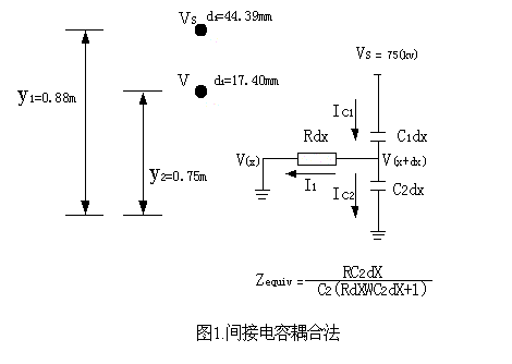 將上述的數(shù)據(jù)代入Thevenin’s等式計(jì)算出導(dǎo)線與ADSS間的電容C1及ADSS對(duì)地電容C2,見(jiàn)圖1: