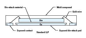 圖 1 顯示的無引線導線封裝 (LLPÒ) 是一種有導線的芯片級封裝 (CSP),其優點是可以提高芯片的速度,降低熱阻以及占用較少印刷電路板的板面空間。由于這種封裝具有體積小巧及外型纖薄的優點,因此最適用于設有模塊式直流/直流轉換器、元件較為密集的多層式印刷電路板。