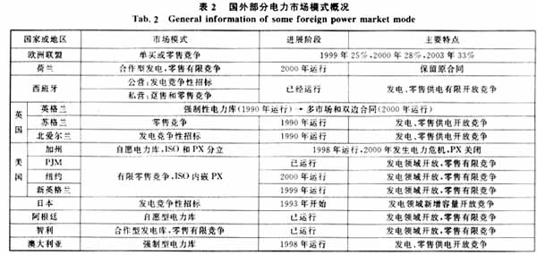 (2)世界各國所采用的電力市場模式多種多樣,即使在同一個國家不同的地區所采用的電力市場模式也不盡相同[24,33~40]。甚至有的國家是兩種模式或幾種模式的綜合,并隨著時間的推移而發生變化。如表2所示。因此,一國的電力市場模式應隨著本國電力工業的發展而發展。