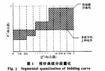 然后將各發電商的報價曲線分段量化,如圖1所示。把報價曲線容量均勻分成n(n可取10,20,50等)段,用Q*來表示;各段電價標么值用P*來表示;系統年平均上網電價標么值用P*來表示。故有