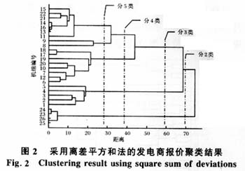 采用離差平方和法,選取2002年8月14日該電力市場的報價數據進行聚類分析,其中報價曲線分段數取20,電力市場價格上限取820元/(MW·h),聚類計算的分析結果如圖2所示。