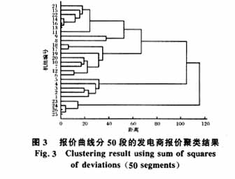 理論上,報價曲線分段數越多,越能真實地反映原報價曲線,但是分段數過多會造成計算量大大增加,報價曲線分段數究竟以多少段為合適是一個需要進行研究的問題。為此,選取與圖2完全相同的報價數據,但將分段數由20增加至50,再進行聚類分析(類間距離計算采用離差平方和),分析結果如圖3所示。