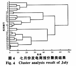 系統聚類法是把個體逐個地合并成一些子集,直至整個總體都在一個集合之內為止。它是聚類分析中應用最廣泛的一種,凡是具有數值特征的變量或樣品都可以采用該方法進行分類。對發電商報價進行聚類分析的步驟如下:(1)聚類前先對數據進行變換處理,得到表征報價曲線的特征向量。(2)聚類分析處理開始時,先將各樣品自成一類,計算各樣品之間的距離,再將距離最近的兩個樣品并成一類。(3)選擇并計算類與類之間的距離,繼續合并直至樣品歸為一類為止。(4)繪制系統聚類譜系圖,按不同的分類標準或分類原則,得出不同的分類結果。在(2)中根據類間距離計算的不同,可以得到多種不同的聚類分析方法:最短距離、最大距離、平均距離、重心距離、離差平方和等。縱觀這幾種方法在不同領域中的分類應用效果,通常以離差平方和法的分類效果較好,故選擇離差平方和法進行分類計算。