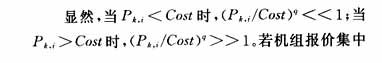 式中:CPIk表示k機組在某時段的量價指數;Pk,i表示k機組在相應時段報價的第i段價格;Cost表示系統平均發電成本;q是冪指數,可以取2~5,通常取3;Ck,i表示k機組在相應時段報價的第i段容量,與Pk,i一一對應;AvailCk表示k機組在相應時段的可用容量。