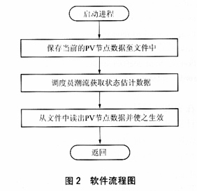 狀態估計數據取完后,調度員潮流應用的網絡庫中的PV節點配置是狀態估計網絡庫默認的不理想配置,發電機機端電壓是狀態估計計算出來的較實際值偏低的電壓。為了屏蔽這些PV節點信息,程序再調用取出PV節點數據的子程序,恢復先前的PV節點數據,使人工設置的PV節點數據不被狀態估計網絡庫所覆蓋,程序流程如圖2所示。