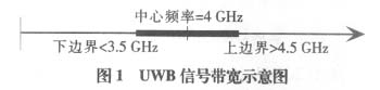 UWB的名稱來源于可在非常寬的帶寬,即超寬帶的帶寬上傳輸信號。所謂超寬帶的帶寬,按美國聯邦通信委員會(FCC)的定義,即是:比中心頻率高25%或者是大于1.5 GHz的帶寬。舉個例子來說,對于一個中心頻率在4 GHz的信號將跨越從3.5 GHz(或更低)至4.5 GHz(或更高)的范圍才能稱得上是一個UWB信號,如圖1所示。UWB無線系統的關鍵技術主要包括:產生脈沖信號串(發送源)的方法,脈沖串的調制方法,適用于UWB有效的天線設計方法及接收機的設計方法等。