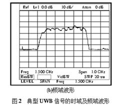 (2)電子方法,基本原理是對半導體PN結反向加電,使其達到雪崩狀態,并在導通的瞬間,取陡峭的上升沿作為脈沖信號。這種方案目前應用得最廣泛,缺點是:由于采用電脈沖信號作為觸發,其前沿較寬,觸發精度受到限制,特別是在要求精確控制脈沖發生時間的場合,達不到控制的精度。另外,由于受晶體管耐壓特性的限制,這種方法一般只能產生幾十伏到上百伏的脈沖,當然,脈沖寬度還可以達1 ns以下。典型的UWB脈沖信號時域波形和頻域波形如圖2所示。