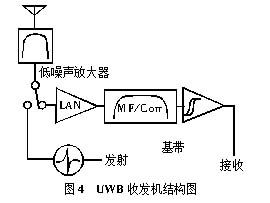 與傳統的無線收發信機的結構相比,UWB收發信機的結構相對簡單,但可以得到相同的性能。例如傳統的無線收發信機大多采用超外差式結構,而UWB收發信機采用零差結構就可得到相同的性能,實現起來也十分簡單,無需本振、功放、壓控振蕩器(VCO)、鎖相環(PLL)、混頻器等環節,如圖4所示。