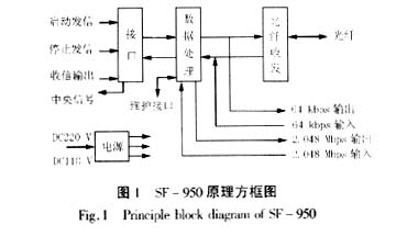 大多數保護應用中,命令必須雙向傳輸,相應的,由SF-950所提供的命令通道也是雙向的。為實現這一點,(1)在保護接口部分,先對開/關命令信號進行采樣、延時等處理,送給數據處理部分進行編碼輸出為64 kbps和2.048 Mbps的信號,同時將信號送給光纖接口部分進行編碼,光電轉換成8.448Mbps光信號;(2)對輸入的光信號進行解碼,轉換成電信號,再對64 kbps信號進行解碼,并控制命令輸出。