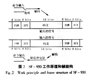 SF-950的幀結構如圖2所示。每個幀包括幀定位和一個用于輔助信息的字節(jié),兩者的長度均為8 bits。這些8位后接著用以傳送保護命令的8位字節(jié)分組碼(64 bits)稱為碼文。一個幀中的比特數為80,而幀時間為1.25 ms。