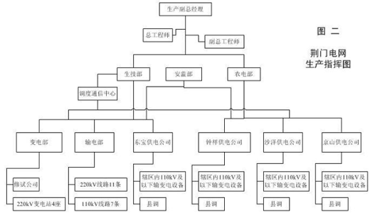 荊門供電公司生產指揮圖如圖二:4個縣級供電公司,主要負責維護110kV及以下輸變電設備的運行、維護、檢修及35kV及以下輸變電設備的調度工作,其中圖一中的東寶變、蘇臺變、興隆變屬東寶公司維護,后港變、沙洋變屬沙洋公司維護,鐘祥變、鄭家灣變屬鐘祥公司維護;變電部負責4座220KV變電所的運行、維護及檢修,棗山變屬其中之一;輸電部負責維護全部220kV和部分110kV輸電線路,荊棗I回線屬其中之一;荊門電力調度通信中心負責荊門電網110kV及以下輸變電設備的調度工作。