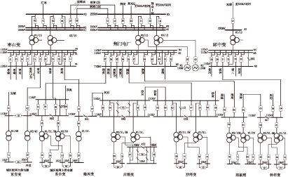 荊門電網目前有220kV變電所4座,110kV變電站18座和一座熱電廠。形成了以220kV變電所為支撐,110kV變電站為骨架的供電網絡。圖一給出了荊門電網反事故演習示意圖。