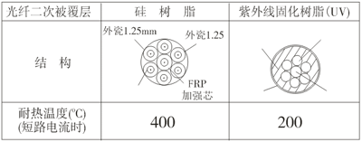 光纖束的結構如表2-1所示。光纖的二次被覆層有二種不同的材料,它們的區別是耐熱溫度不同。