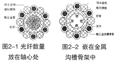 光纖起著系統通信及傳送信號等作用。它的外面通常都包有一層或幾層由隔熱性能良好的材料制成的護套,以免在線路發生單相接地故障時,光纖的溫度過高。根據不同需要,光纖的數量可由幾根到幾十根不等,它們一般分成一束或幾束放在OPGW的軸心處(見圖2-1),或嵌在位于軸心位置的金屬溝槽骨架(見圖2-2)。
