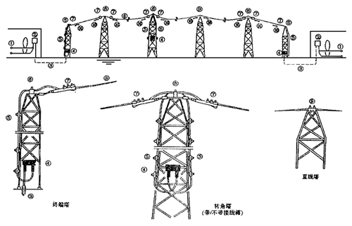 ①—光纖;②—光纖分配盒;③—無金屬光纜;④—接線箱;⑤—固定線夾;⑥—跳線;⑦—耐張線夾;⑧—OPGW;⑨—懸垂線夾;⑩—防振錘