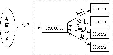 專網(wǎng)仍以C&C08機(jī)為出入口,采用NO.7信令與中國(guó)聯(lián)通進(jìn)行網(wǎng)間直聯(lián)互通,4套Hicom交換機(jī)分別與C&C08機(jī)采用NO.1信令相聯(lián),經(jīng) C&C08機(jī)匯接出局、入局。