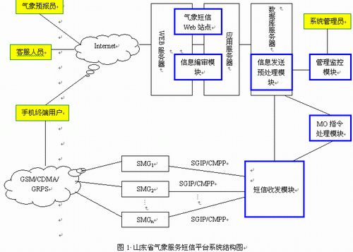 氣象服務短信平臺主要由如下模塊組成:信息編審模塊、氣象服務定制WEB站點、MO指令處理模塊、信息發送預處理模塊、短信收發模塊和管理監控模塊。系統結構圖詳見圖1。