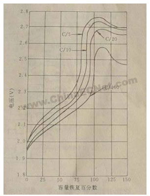初始的時間與充電速率有關。當充電速率大于C/5時,電池容量恢復到放出容量的80%以前,即開始過充電反應,如右圖所示。只有充電速率小于C/100,才能使電池容量恢復到100%后,才開始過充電反應。由右圖還可以看出,采用較大充電速率時,為了使電池容量恢復到100%,必須允許一定的過充電,過充電反應發生后,單格電池的電壓迅速上升,達到一定數值后,上升速率減小,然后電池電壓開始緩慢下降。由此可知,電池充足電后,維持電池容量的最佳方法是在電池組兩端加入恒定的是壓。這就是說,電池充足電后,充電器應輸出恒定的浮充電壓。在浮充狀態下,充入電池的電流應能補充電池因自放電而失去的電量。浮充電壓不能過高,以免因嚴重過充電而縮短電池的壽命。采用適當的浮充電壓,免維護鉛酸蓄電池的浮充壽命可達10年以上。實踐證明,實際的浮充電壓與規定的浮充電壓相差5%時,免維護蓄電池的壽命將縮短一半。