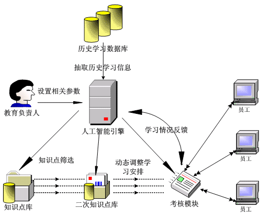 系統在人工智能(AI, Artificial Intelligence的簡稱)的基礎上,為每個員工提供了一個完全智能的學習導師系統。通過該機制的使用,能夠極大地提高員工的學習效率。借鑒國際上近年來數字校園領域(Digital Campus)發展的最新成果,針對計算機教學的特殊性(能動態收集學生的所有學習情況、能動態對考生學習情況進行人工