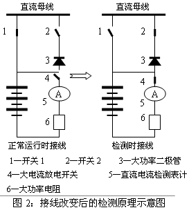 根據前面的分析,現將蓄電池組接線增加以下簡單回路,利用二極管的單向導通特性,以達到蓄電池短時“準退出”狀態,實現不影響直流系統正常運行的同時,進行蓄電池在線測量及放電試驗時,準確查找出異常蓄電池。(圖2所示為接線改變后的檢測原理示意圖)