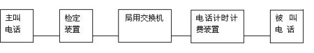 將檢定裝置接入主叫電話、局用交換機、電話計時計費裝置和被叫電話組成的通話電路中,接收局用交換機發送的反極信號,進行計時誤差的檢定(測試如圖2所示)。檢定裝置設定任意一個計時檢定點,主叫方向被叫電話發號,被叫方摘機,檢定裝置發送反極信號,并與電話計時計費器同時啟動計時,至設定的計時檢定點時,檢定裝置與電話計時計費器同時停止計時。記錄檢定裝置的標準計時值與電話計時計費器的被測時長,取被測時長的平均值,計算計時誤差。