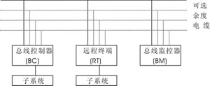 1553B總線網(wǎng)絡(luò)由終端、子系統(tǒng)和總線傳輸介質(zhì)組成,結(jié)構(gòu)如圖1所示。終端是使數(shù)據(jù)總線與子系統(tǒng)相連接的電子組件。子系統(tǒng)為從多路數(shù)據(jù)總線上接收數(shù)據(jù)傳輸服務(wù)的裝置或功能單元。總線控制器(BC)是總線系統(tǒng)組織信息傳輸?shù)慕K端。總線監(jiān)控器(BM)是總線系統(tǒng)中指定作接收且記錄總線上傳輸?shù)男畔⒉⒂羞x擇地提取信息以備后用的終端。遠(yuǎn)程終端(RT)是總線系統(tǒng)中不作為總線控制器或總線監(jiān)控器的所有終端。