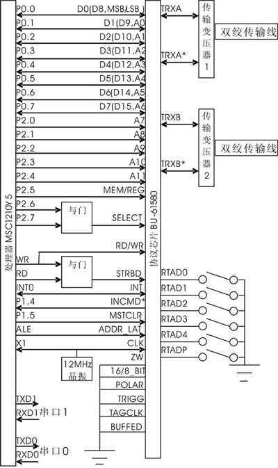 圖2中,MSC1210Y5與BU-61580為8位總線接口,61580的“16/8_BIT”、“BUFFED”、“POLAR”接為低;使用了0等待控制,“ZW”接為低;使用了BU-61580內(nèi)部的RAM,“TRIGG”接為低;不使用外部時(shí)鐘標(biāo)簽,“TAGCLK”接為低。