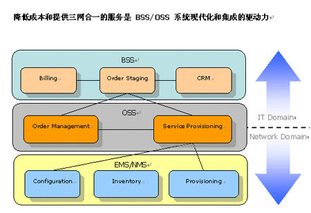 我們可以看到,集成現(xiàn)存的OSS/BSS即 NMS/EMS 是 三網(wǎng)合一的必然要求。 然而傳統(tǒng)的EAI和BPM集成產(chǎn)品是被設(shè)計成滿足IT部門集成CRM或ERP等應(yīng)用的需要,很少被用于OSS層面,原因很簡單:BSS中的系統(tǒng)多半是單一廠商提供的,只和BSS中的特定應(yīng)用打交道。然而, 在OSS 層面, 幾乎所有的運營商網(wǎng)絡(luò)都是有不同的結(jié)構(gòu)和技術(shù),需要定制的OSS應(yīng)用來管理這些網(wǎng)絡(luò)。這使這些應(yīng)用難以適應(yīng)OSS層面的需要;另外的原因是OSS層面的交易量比BSS層面要大,傳統(tǒng)的EAI 和 BPM難以滿足其性能要求。