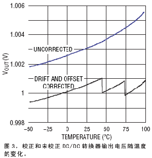 LTC2970的絕對準確度如圖3所示。LTC2970配置成:如果LTC3728 DC/DC轉換器的電壓偏離超過±1%,LTC2970就跟隨該轉換器的輸出之一直到1V。在LTC2970和DC/DC轉換器一起從-50℃加熱到 100℃時,LTC2970能夠非常容易地保持輸出電壓在1V的±1mV之內。當LTC2970與LTC3728隔離時,在同樣的溫度范圍內, LTC2970的輸出電壓漂移在1.002V至1.0055V之間。