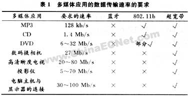 表1是一些典型的實時多媒體應用對不同無線傳輸技術的數據傳輸速率的要求,從表中可以看出,如果采用無線的方式來進行傳輸,只有UWB技術可以滿足各種應用的要求。