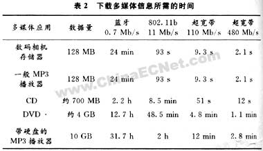 表2為下載一些多媒體信息所需的時間,采用UWB技術,可以在合理的時間內完成下載,隨著多媒體應用的發展,其類似大小和所需傳輸速率還將不斷提高,因此,在目前的無線通信技術中,只有UWB技術可以滿足構建無線多媒體家域網的要求。