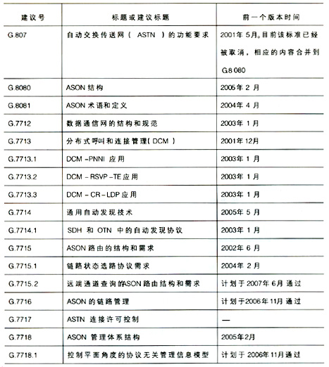 ITU-T對ASON(自動交換光網絡)控制平面的標準化情況見表1。許多已通過的建議(如G.8080、G.7713等)會隨著ASON技術的發展不斷完善,因此每年都會通過一些相關的修訂文件。
