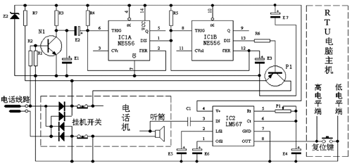 當(dāng)發(fā)送方撥打接收方號碼時,振鈴信號通過由三極管N1、時基電路IC1A(NE556)及其外圍元件組成的“振鈴檢測電路”,啟動由時基電路IC1B(NE556)、三極管P1及其外圍元件組成的“延時自動接聽及掛機電路”進行延時。延時至30秒左右時,通過三極管P1將電話接通,此時發(fā)送方即可將音頻編碼信號發(fā)出。由IC2(LM567)及其外圍元件組成的“鎖相環(huán)單音解碼電路”從電話機的聽筒端接收到音頻編碼信號后,IC2(LM567)的輸出端(8腳)由高阻狀態(tài)變?yōu)榈碗娖剑瑢㈦娔X主機的復(fù)位鍵短路,從而實現(xiàn)電腦主機的重啟。