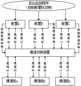 這種切換方式的優點是前置機處理的數據量相對較少。始終保持值班機接主通道,備機接備用通道,連接方式清晰,可以同時對兩個通道的運行狀況進行監視。缺點是切換過程較繁鎖。