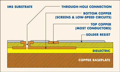即使假設(shè)通過(guò)采用提高效率的方式(例如直流/直流轉(zhuǎn)換器常用的方式)可以達(dá)到高于平均值的效率,我們的輸出率和效率目標(biāo)也表明原型設(shè)計(jì)必須在全負(fù)載時(shí)能夠散發(fā)高達(dá)100瓦的熱量。通過(guò)以熱耦合方式耦合至散熱片或其它散熱表面,可以有效地將原型產(chǎn)品基板上的熱量散去。這里的問(wèn)題是如何將組件的熱量通過(guò)印刷電路板轉(zhuǎn)移至基板。特別要注意的是,很明顯使用傳統(tǒng)的FR4 印刷電路板材料無(wú)法滿足散熱要求。但是另一種選擇,絕緣金屬基板(IMS)技術(shù)(銅箔軌和金屬基板間夾有一個(gè)薄薄的電介質(zhì)層,如圖4所示)卻能提供一種滿足散熱要求的方法。