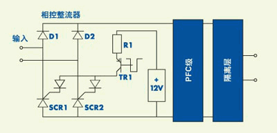 這種作法也提供勝于熱敏電阻等方法的保護(hù)功能。在經(jīng)過(guò)一段時(shí)間的低輸入電壓下的低負(fù)載后,負(fù)載的增加可能造成大量電壓損耗,導(dǎo)致裝置跳閘或無(wú)法調(diào)整,直至熱敏電阻的溫度上升。有了SCR設(shè)計(jì)提供的浪涌保護(hù)后,輸入電壓不再以這種方式下降。使用SCR方法后,仍會(huì)發(fā)生浪涌現(xiàn)象,但浪涌會(huì)降低至可接受的水平。這也有助于保險(xiǎn)絲的選擇,因?yàn)槔擞侩娏鞯挠行е敌∮诜(wěn)態(tài)電流。盡管電流脈沖可能會(huì)很大(僅受到電源和輸入濾波器阻抗的限制),浪涌均方根值(是選擇保險(xiǎn)絲或斷路器時(shí)的關(guān)鍵參數(shù))還是完全位于可能會(huì)使用的最小裝置的性能范圍之內(nèi)。并且,因?yàn)檫@一最新的浪涌控制機(jī)制,保險(xiǎn)絲可以是高熔斷類型中最常見(jiàn)的“F”型(快熔型)。