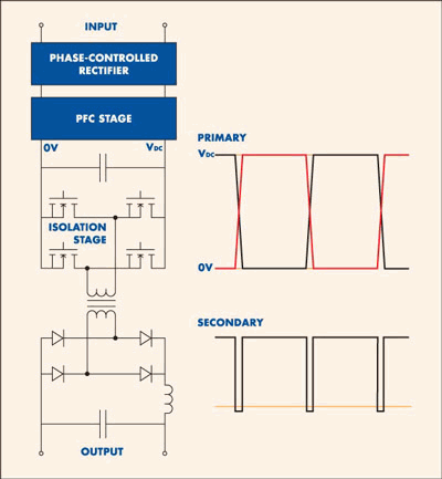 對(duì)熱性能的嚴(yán)格要求可以通過(guò)在轉(zhuǎn)換器內(nèi)盡量減少開(kāi)關(guān)損耗得以緩解。全橋式轉(zhuǎn)換器所使用的模塊化方法對(duì)損耗的產(chǎn)生有重大影響。對(duì)這一問(wèn)題的了解促進(jìn)了中間總線DC/DC轉(zhuǎn)換器設(shè)計(jì)的變化,但是直到現(xiàn)在,這些變化還未被應(yīng)用于AC/DC轉(zhuǎn)換階段。