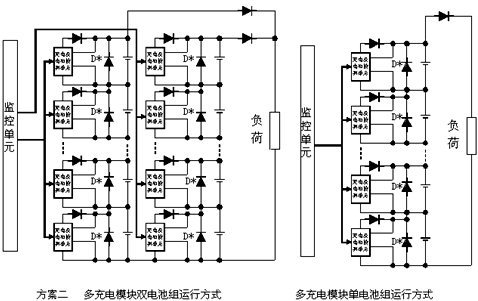 大家應(yīng)該注意到本方案二中沒有備分的概念,其原因之一是本身小容量充電設(shè)備的高可靠性使得它不需要備分,原因之二在于熱插拔抽出式結(jié)構(gòu)的采用,和二極管 D*的存在在更換檢修模塊和電池時只是系統(tǒng)的電壓會降低一些(在允許范圍內(nèi)),將不會影響系統(tǒng)的正常運行,因此本系統(tǒng)不需要額外的冗余備分。
