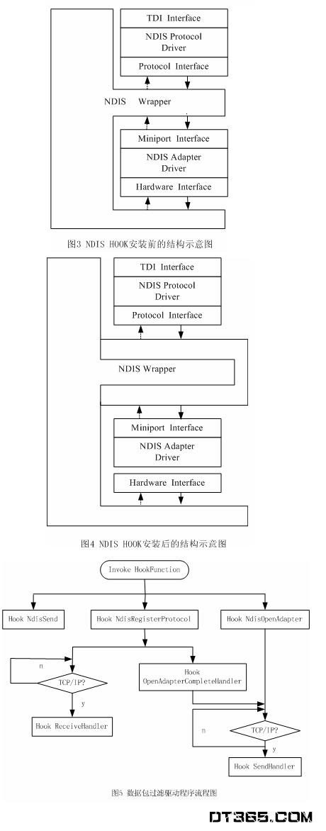 3、 NDIS HOOK 解決了IM Driver和TDI Filter Driver具有的問題,是較為常用的數(shù)據(jù)包過濾技術(shù)。NDIS HOOK 的工作原理是直接替換NDIS的函數(shù)庫中函數(shù)地址,這樣只要向NDIS發(fā)出的請求,就會(huì)先經(jīng)過自己編寫的函數(shù)處理,這些函數(shù)可以過濾掉特定的網(wǎng)絡(luò)數(shù)據(jù)包再轉(zhuǎn)發(fā)給系統(tǒng)函數(shù)。NDIS HOOK安裝前后的結(jié)構(gòu)示意圖分別如圖3和圖4所示。NDIS HOOK可以完成NDIS函數(shù)和TDI函數(shù)所能完成的功能,而且攔截的是較為底層的數(shù)據(jù)包,不容易被滲透。
