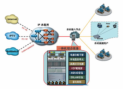 烽火通信在2005年的山西移動(dòng)“村村通”工程中,利用其自身深厚的技術(shù)底蘊(yùn)、豐富的工程項(xiàng)目經(jīng)驗(yàn)、開拓的創(chuàng)新理念,根據(jù)農(nóng)村節(jié)點(diǎn)建設(shè)成本低廉、開通維護(hù)簡便的特點(diǎn)要求,設(shè)計(jì)推出了“農(nóng)村節(jié)點(diǎn)綜合接入一體化設(shè)備”,此款產(chǎn)品將開關(guān)電源、蓄電池、音頻配線架、IAD/AG接入網(wǎng)關(guān)設(shè)備進(jìn)行打包配置,利用數(shù)據(jù)通信承載網(wǎng)絡(luò)實(shí)現(xiàn)終端用戶的有線接入,實(shí)現(xiàn)農(nóng)民家中的語音通話。
