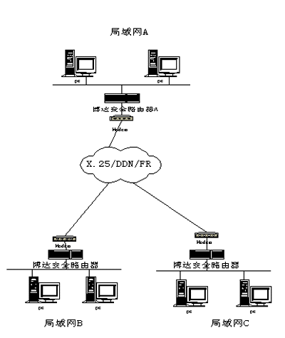 為了提高所傳輸的數據的安全性可以考慮使用安全路由器。安全路由器可以隱藏公司內部的網絡拓撲結構圖,同時還可以加密需要傳輸的數據,從而做到即使傳輸的數據在公網上給其它用戶攔截到時,他們也不能通過IP包來獲取公司內部的網絡IP地址及了解到內部的網絡拓撲結構圖,經過加密的數據,沒有專門的解密工具一般的用戶是不可能知道所傳輸的數據包的內容。使用安全路由器的網絡拓撲圖如下圖所示: