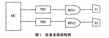 圖1中S1,S2為仿真廠站設備,從而為SCADA仿真系統提供廠站信息的模擬臺;RTU1,RTU2為2個廠站終端;TD1,TD2為信息傳送的通信通道;DC為SCADA仿真系統的調度中心計算機系統,由多臺微機組成,其結構如圖2所示。