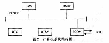 圖2中FCOM為前置通信工作站;RTC為實時監控工作站;HWM為歷史數據管理工作站;EMS為能量管理工作站;RTNET為微機實時網絡;RTSV為實時服務器。考慮到仿真系統的經濟性,沒必要設置冗余的服務器和前置通信工作站,通信通道采用具有屏蔽層的四芯通信電纜,兩端接調制解調器(Modem)以便使得信息能夠遠傳和提高抗干擾能力。RTNET是采用BNC接頭將所有調度中心的所有計算機用細纜聯結成實時網絡。而且因為仿真系統不可能和廠站的實際設備相連,故廠站端的信息也是采用模擬的方法提供,在模擬信息臺上用開關仿真廠站的斷路器的開合以提供遙信信息,用燈的亮或滅來仿真遙控信息從而模擬廠站的斷路器的動作,而用可調的感性負載來提供遙測量的仿真,用直流表來仿真遙調的結果。