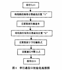 串行通信口初始化的流程圖如圖4所示,可設通信速率為600b/s,字結構除同步字外均采用(48,40)碼,同步字為3組EB90。校驗位依據40位信息位的代碼值和生成多項式g(x)=x8+x2+x+1進行代數運算計算最后的校驗碼,由于規約規定是帶陪基形成的校驗碼,最后必須按位取一次反。各信息字的組織格式遵守CDT規約。通訊采用中斷方式,對于中斷類型N,其中斷服務處理程序的偏移量和段基址為IP≤(4*N,4*N+1),CS≤(4*N+2,4*N+3),而80x86系列PC機規定通信適配器COM1使用中斷IRQ4(N=12),COM2使用中斷IRQ3(N=11),故可按上述計算IP,CS的公式設置中斷矢量。