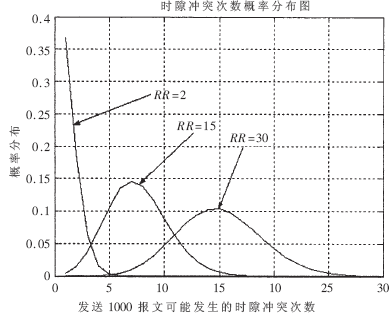 當發送n次連續的報文時,對于固定的報文數量,RR越高,意味著每幀中傳送的報文越多,而需要傳送的總幀數越少,反之亦然。由于各幀相互獨立,各幀中的每個時隙窗口也相互獨立,由二項分布可知,在n次發送報文中,有L次時隙沖突的概率分布為: