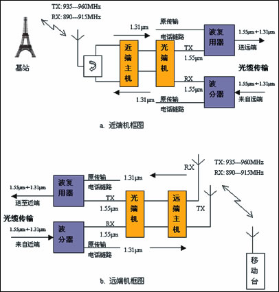 首先,在WGPA新建一套微蜂窩基站,通過分布系統對WGPA的食堂、小屋202,203,204,205,206,207進行覆蓋,耦合一路信號給光纖直放站近端,將射頻信號轉換成光信號,通過光纖將光信號傳到FPSO;在WGPA平臺通過微波提供2M口專線,經協議轉換器連接交換機,用網線連接需要上網的電腦,實現WGPA登錄Internet,交換機輸出一路經光端機連接到FPSO,從而實現FPSO登錄Internet。如現有光纖已全部使用,可采用波分復用,如已用的波長為1.31μS,我方可采用波長1.55μS來傳輸,參照圖2。在FPSO新建一臺光纖直放站遠端,將WGPA傳過來的光信號轉換成射頻信號,并進行放大,通過分布系統對FPSO的大的會議房間,OIM經理辦公室,應急反應間(秘書辦公室),所有三層和四層的工程師,資深技術人員和管理員,直升飛機候機室和所有的小屋進行覆蓋。FPSO新增4部移動和固定電話:OIM辦公室,大會議室,應急反應間,WGPA平臺總監辦公室。在項目第一期著重解決FPSO與WGPA的通信問題,WHPA和WHPD將在未來二期解決。